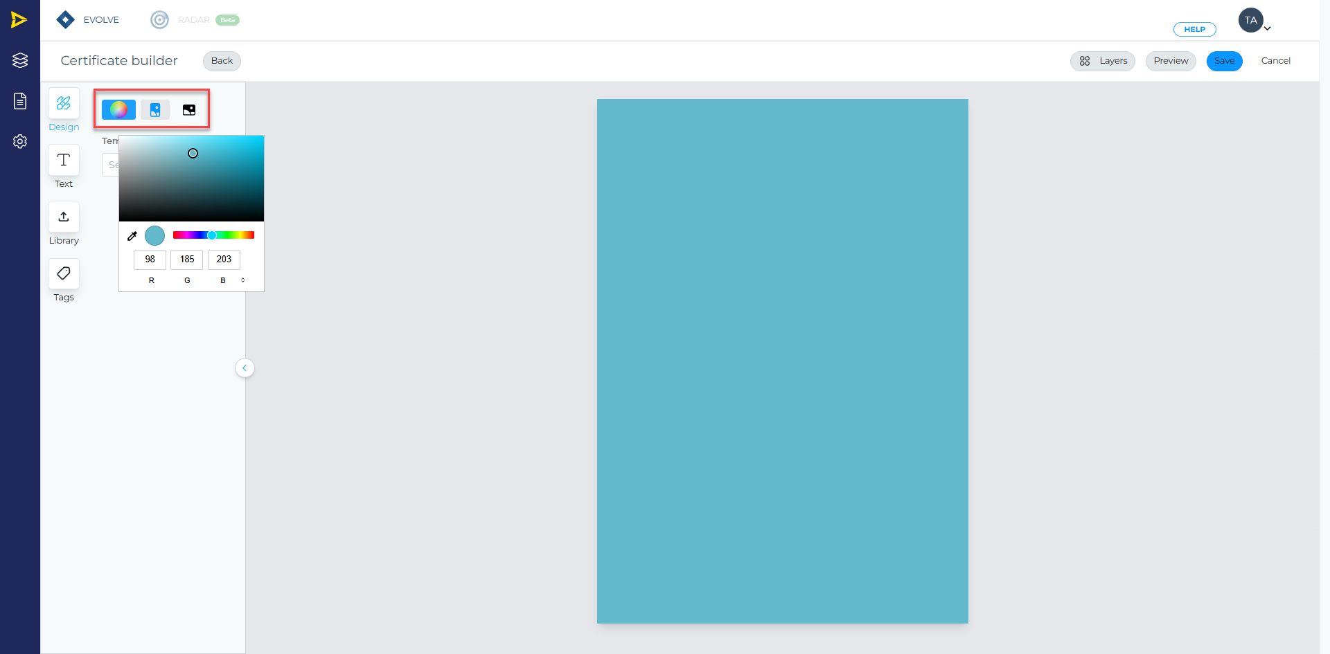 Use the left-hand menu to add elements to the certificate.