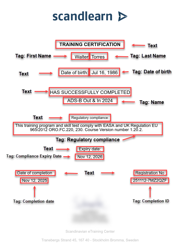 Position and Format: Drag the tag to its desired location (e.g., under "Training Certification"). Use the Properties Bar to adjust its size and style, just like regular text.